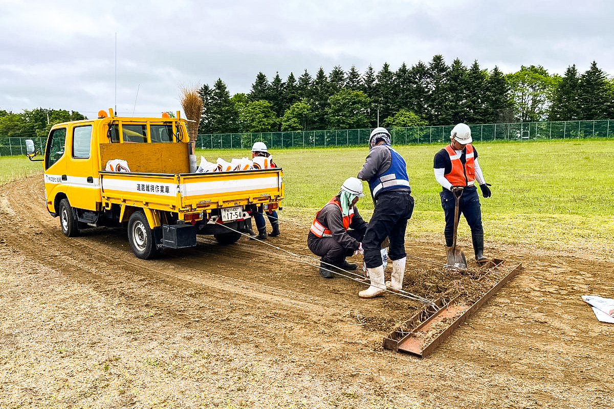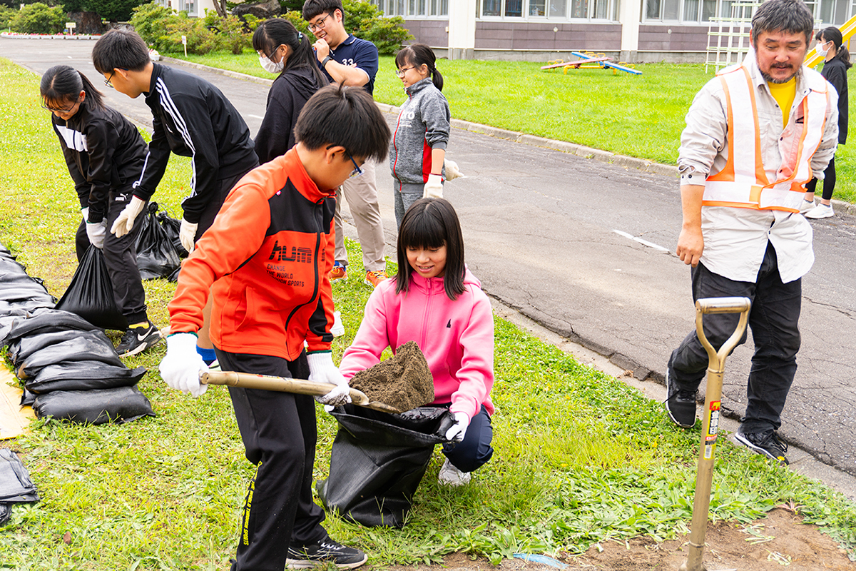 下川商業高校にて、校内の舗装整備や駐車場除雪を社員が自主的にボランティアで実施。地域の学び舎を陰で支えています。