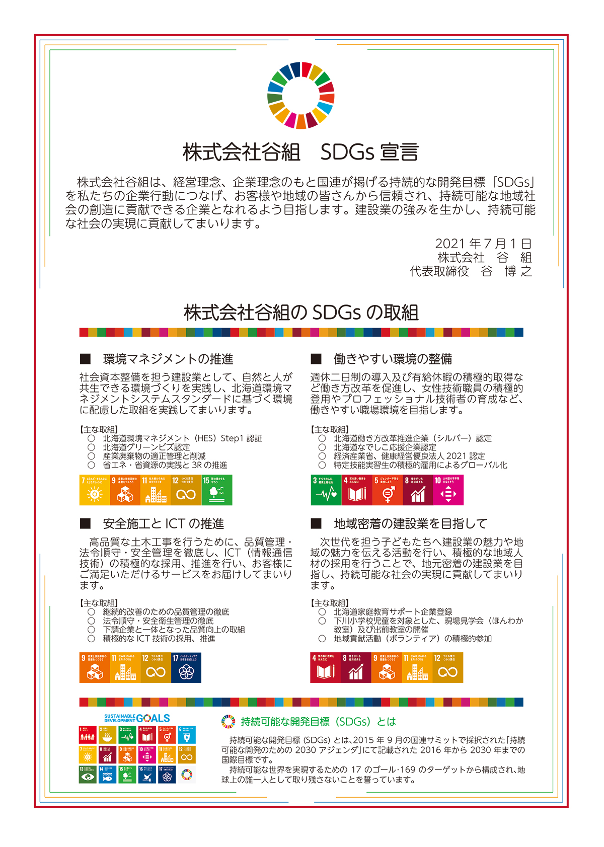「貧困をなくそう」「質の高い教育をみんなに」「エネルギーをみんなに、そしてクリーンに」など、17の目標と169のターゲットで構成されており、すべての人が安心して暮らせる社会を実現するための指針となっています。谷組ではこの理念に共感し、地域社会と共に持続可能な未来を創る企業を目指しています。