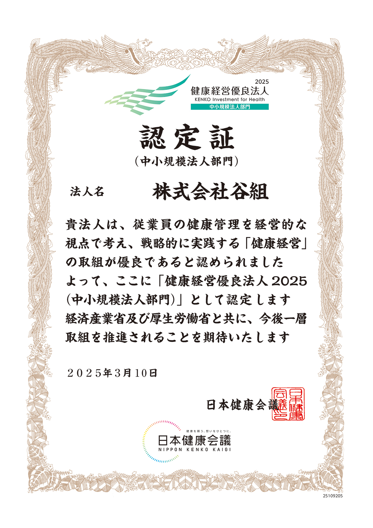 株式会社谷組では、昨年に引き続き(2021年度から継続)日本健康会議(経済産業省・厚生労働省)健康経営優良法人2025の認定(令和7年3月10日付)を受けました。