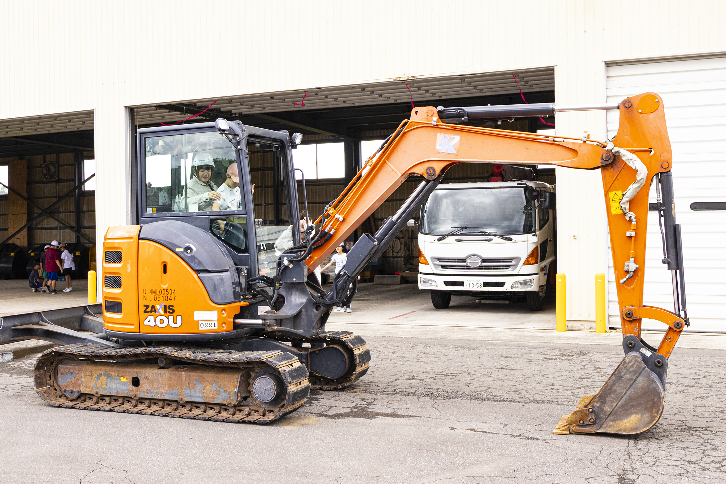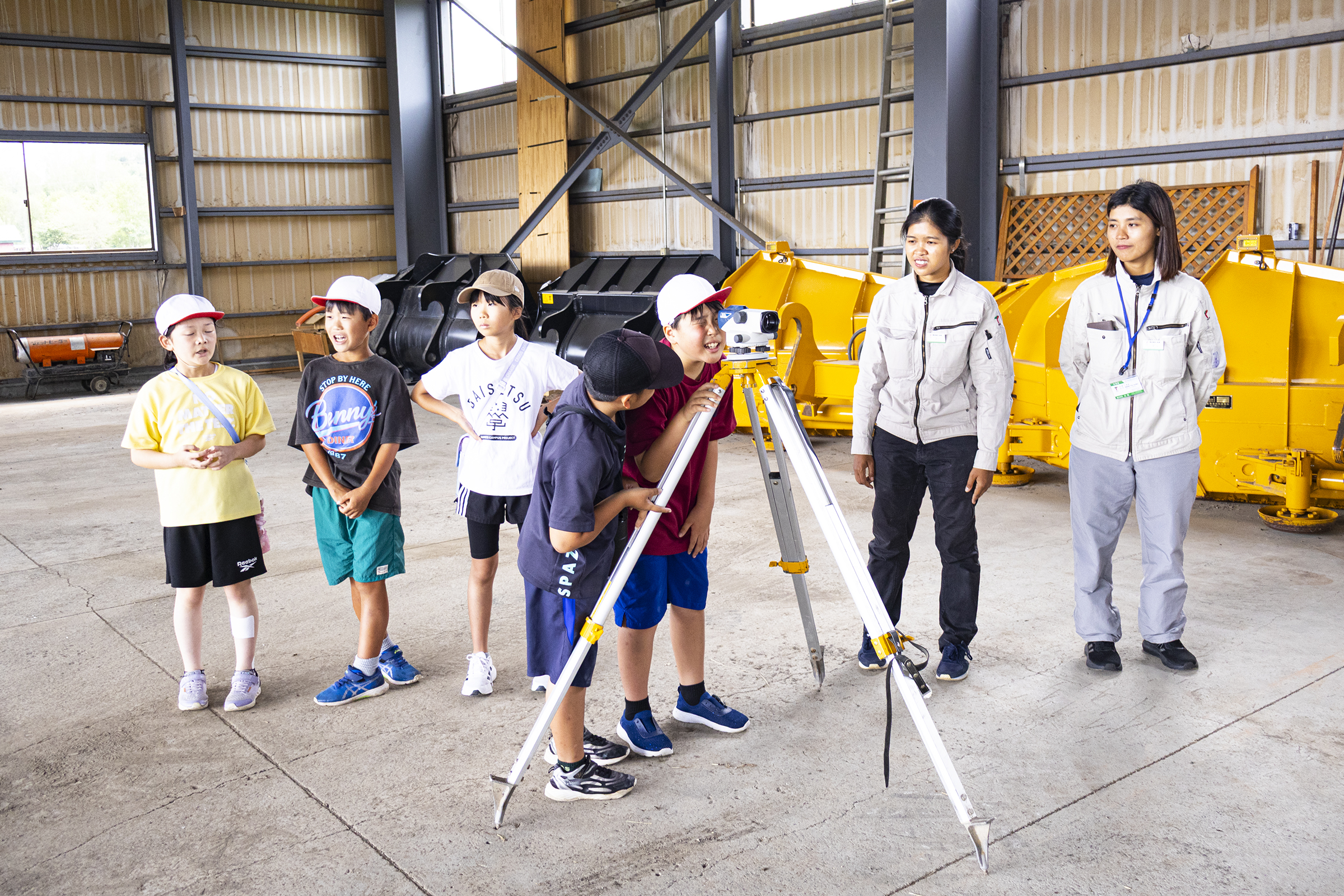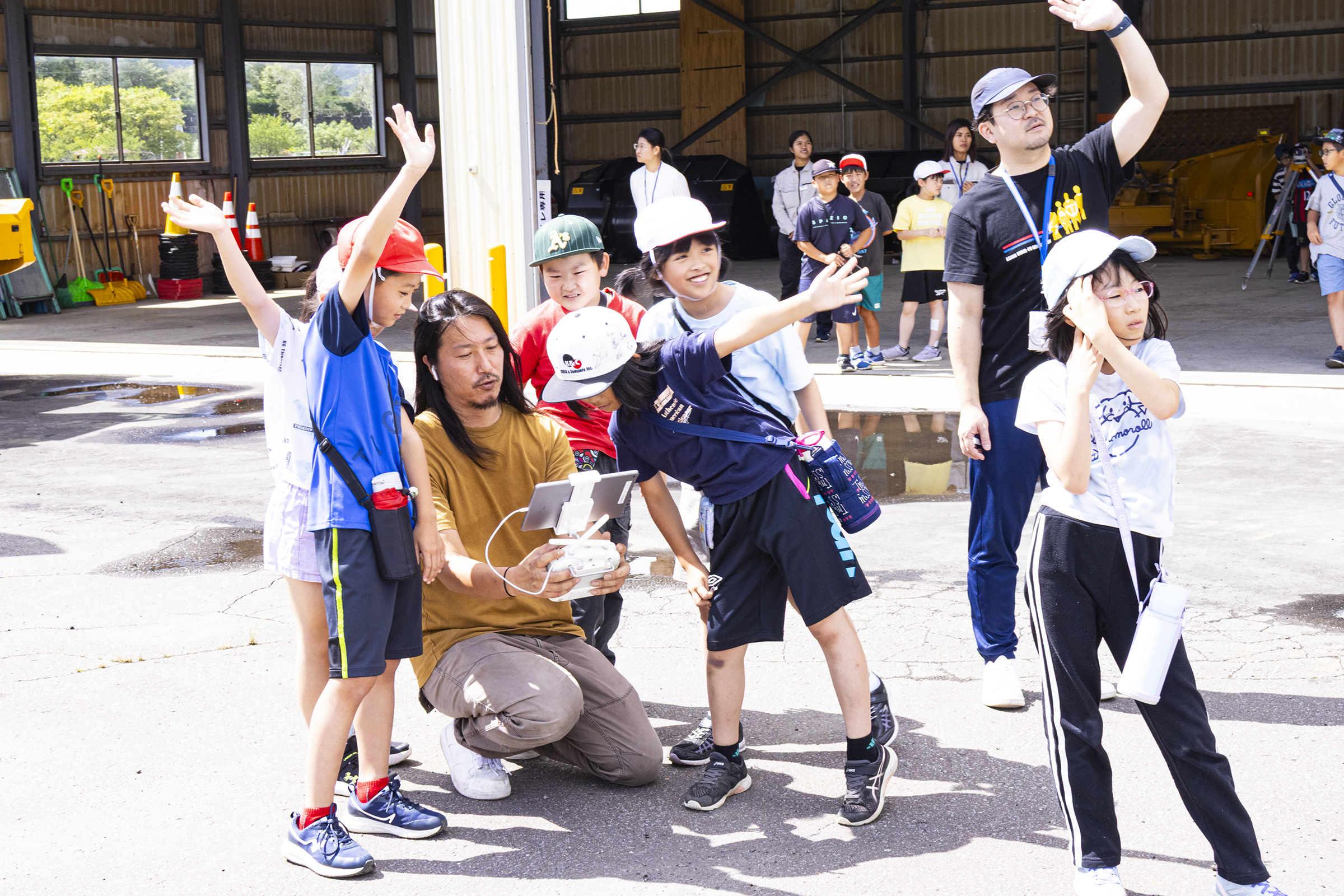 その後、谷組下川支店車庫に移動し、建設現場学習として「ドローン操縦体験」「測量機器体験」「重機運転操作体験」を行い、ほんわか教室を終了いたしました。