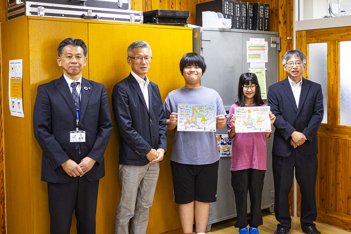 この活動については、10年以上継続して行っている地域貢献活動で、子ども達が地域の魅力を知ってもらい、社会学習のお役に立てて頂きたいとの思いから、北海道マップを贈呈させて頂いております。