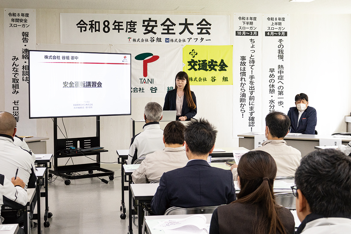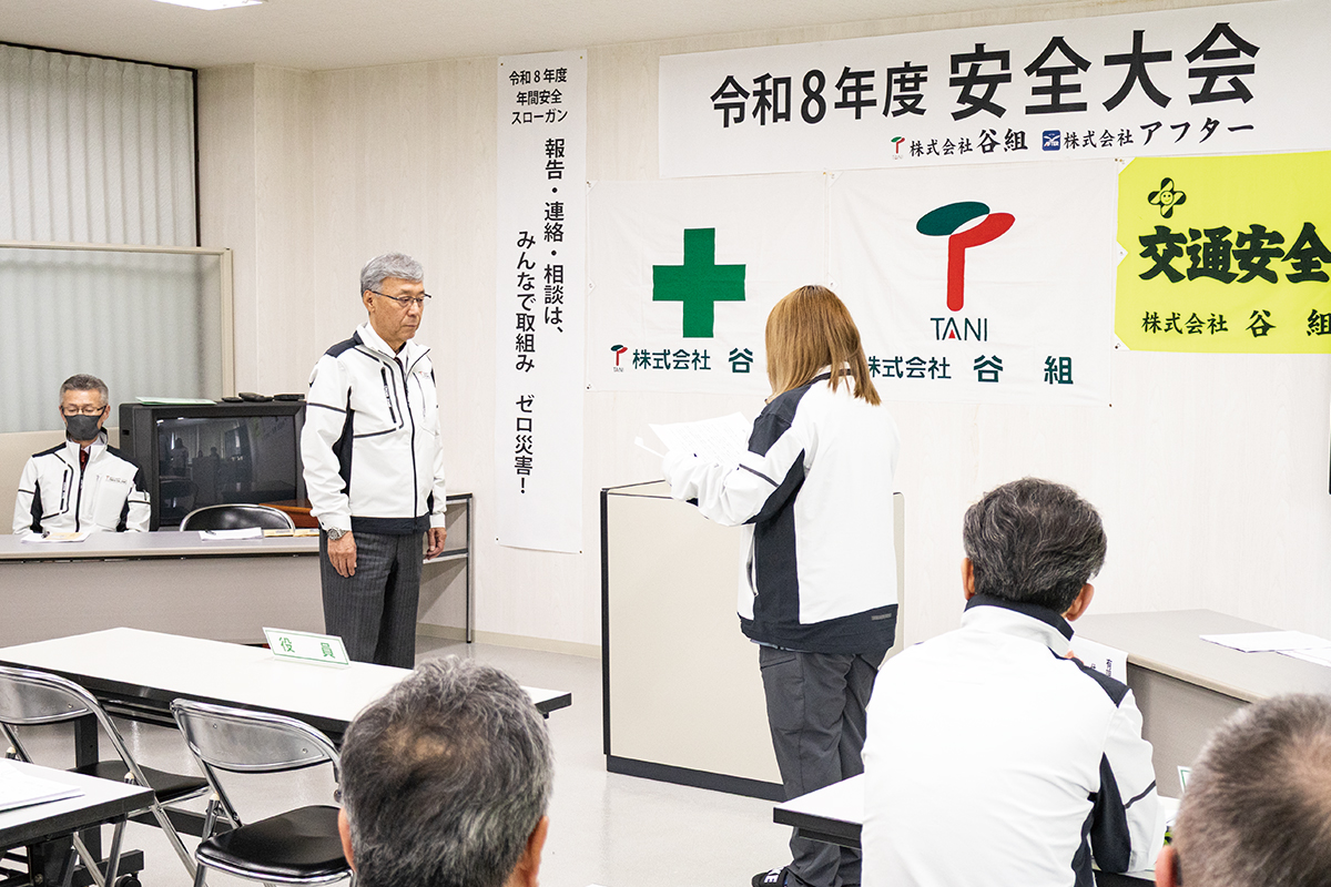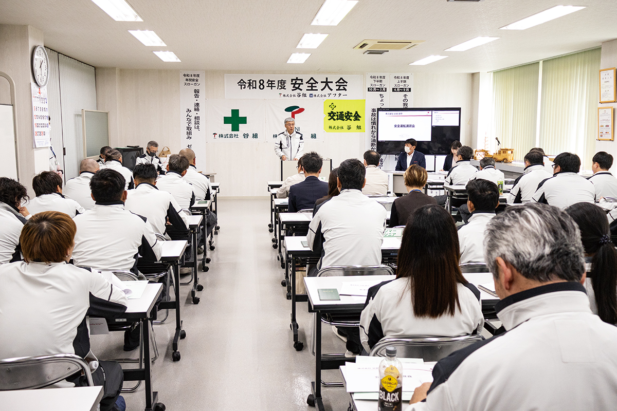 安全講話終了後、令和8年度安全スローガンの発表及び令和7年度セーフティーラリーの結果発表を行い、最後に従業員を代表して、業務推進課・髙橋より安全宣言を読み上げ、安全大会を終了いたしました。(安全宣言の動画は谷組Facebook、Instagramに掲載しています!)