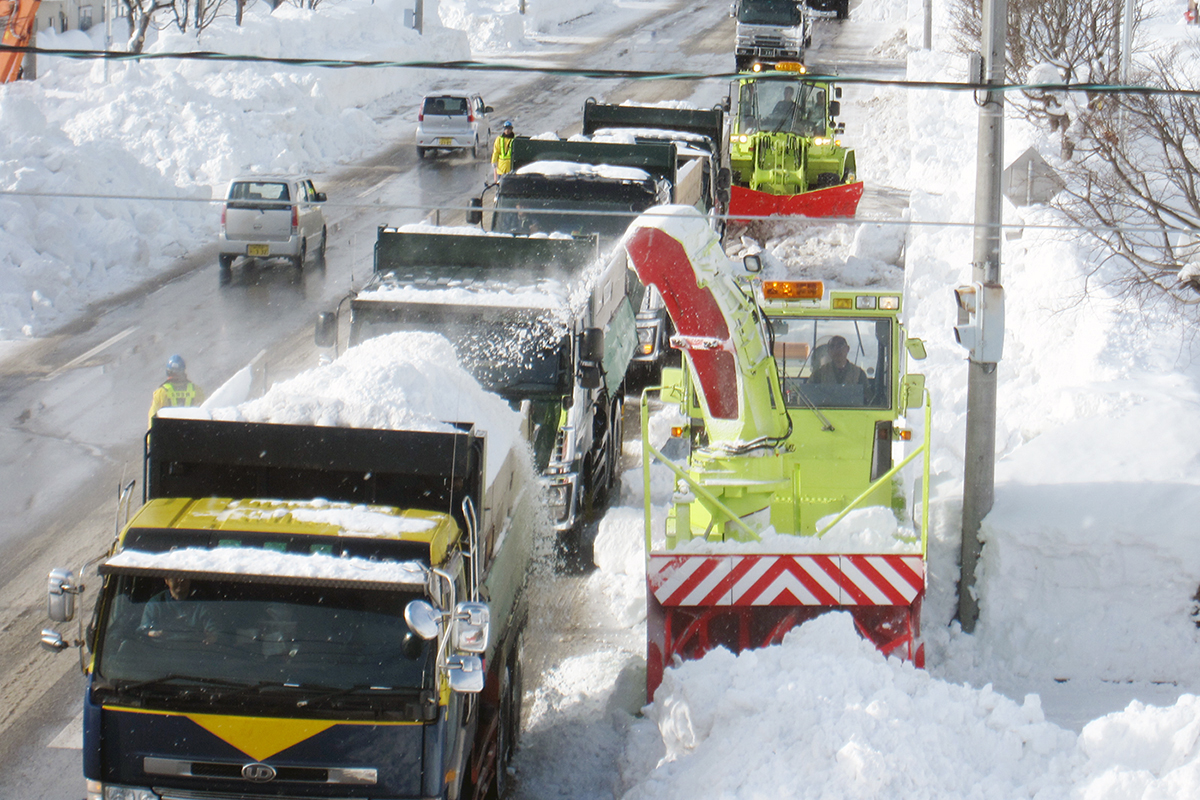 • 排雪・雪山処理作業:除雪車で集めた雪を雪捨て場へ運搬し、道路幅の確保と視界の安全を守ります。特に交差点やバス停付近は重点的に対応。